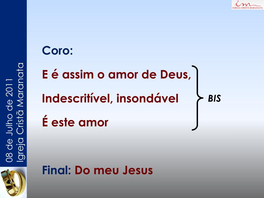 Coro: E é assim o amor de Deus, Indescritível, insondável É este amor Final: Do meu Jesus BIS 08 de Julho de 2011 Igreja Cristã Maranata