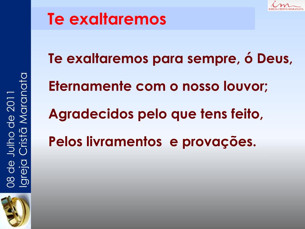 Te exaltaremos Te exaltaremos para sempre, ó Deus, Eternamente com o nosso louvor; Agradecidos pelo que tens feito, Pelos livramentos e provações. 08 de Julho de 2011 Igreja Cristã Maranata