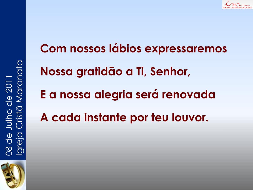 Com nossos lábios expressaremos Nossa gratidão a Ti, Senhor, E a nossa alegria será renovada A cada instante por teu louvor. 08 de Julho de 2011 Igreja Cristã Maranata