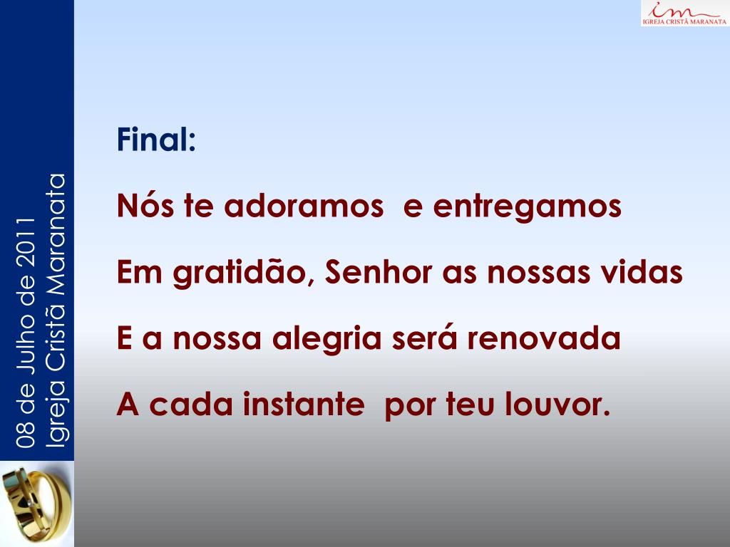 Final: Nós te adoramos e entregamos Em gratidão, Senhor as nossas vidas E a nossa alegria será renovada A cada instante por teu louvor. 08 de Julho de 2011 Igreja Cristã Maranata