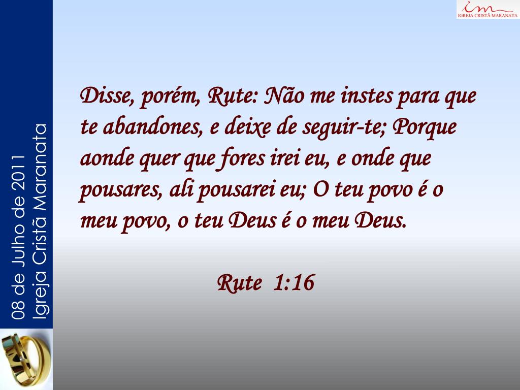 Disse, porém, Rute: Não me instes para que te abandones, e deixe de seguir-te; Porque aonde quer que fores irei eu, e onde que pousares, ali pousarei eu; O teu povo é o meu povo, o teu Deus é o meu Deus. Rute 1:16 08 de Julho de 2011 Igreja Cristã Maranata