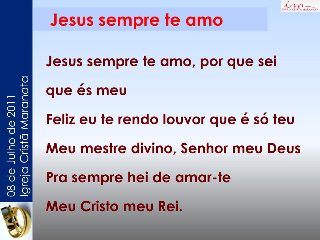 Jesus sempre te amo Jesus sempre te amo, por que sei que és meu Feliz eu te rendo louvor que é só teu Meu mestre divino, Senhor meu Deus Pra sempre hei de amar-te Meu Cristo meu Rei. 08 de Julho de 2011 Igreja Cristã Maranata