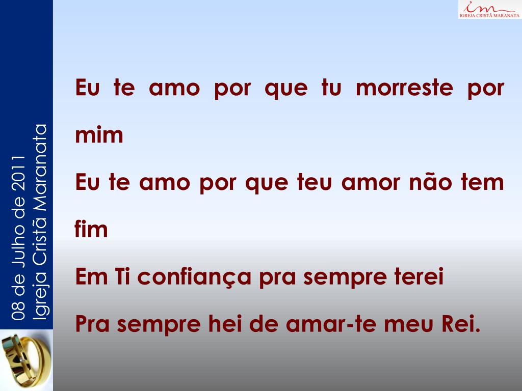 Eu te amo por que tu morreste por mim Eu te amo por que teu amor não tem fim Em Ti confiança pra sempre terei Pra sempre hei de amar-te meu Rei. 08 de Julho de 2011 Igreja Cristã Maranata