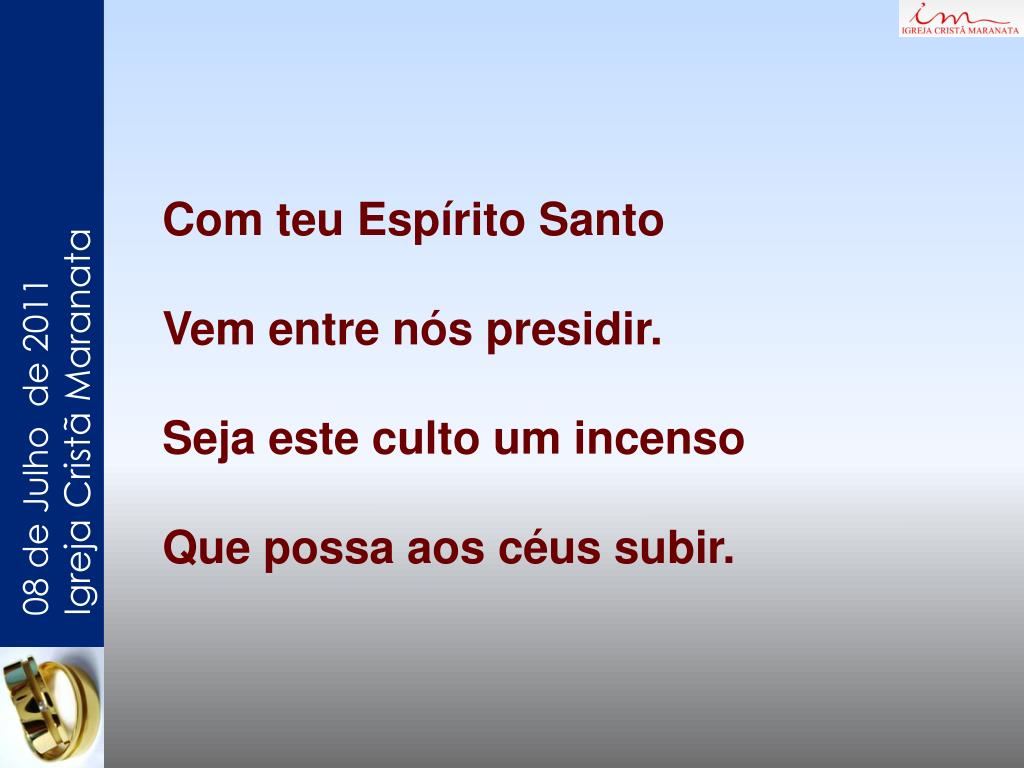 Com teu Espírito Santo Vem entre nós presidir. Seja este culto um incenso Que possa aos céus subir. 08 de Julho de 2011 Igreja Cristã Maranata