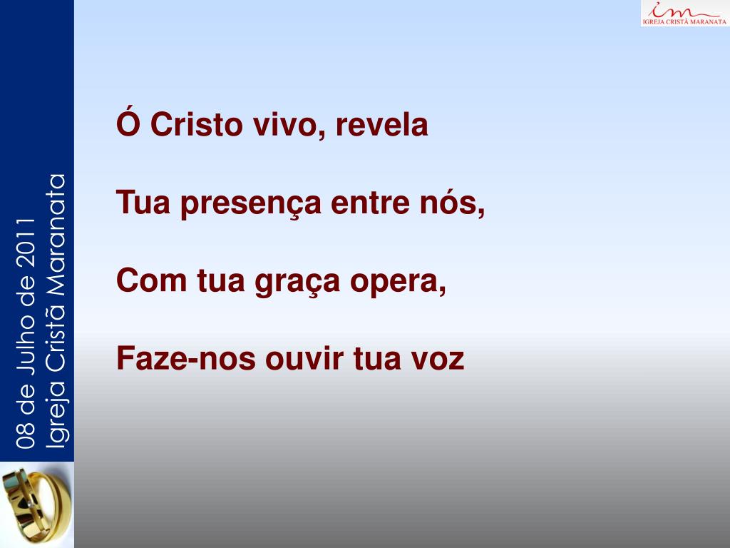 Ó Cristo vivo, revela Tua presença entre nós, Com tua graça opera, Faze-nos ouvir tua voz 08 de Julho de 2011 Igreja Cristã Maranata