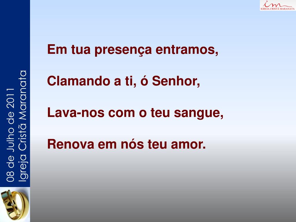 Em tua presença entramos, Clamando a ti, ó Senhor, Lava-nos com o teu sangue, Renova em nós teu amor. 08 de Julho de 2011 Igreja Cristã Maranata