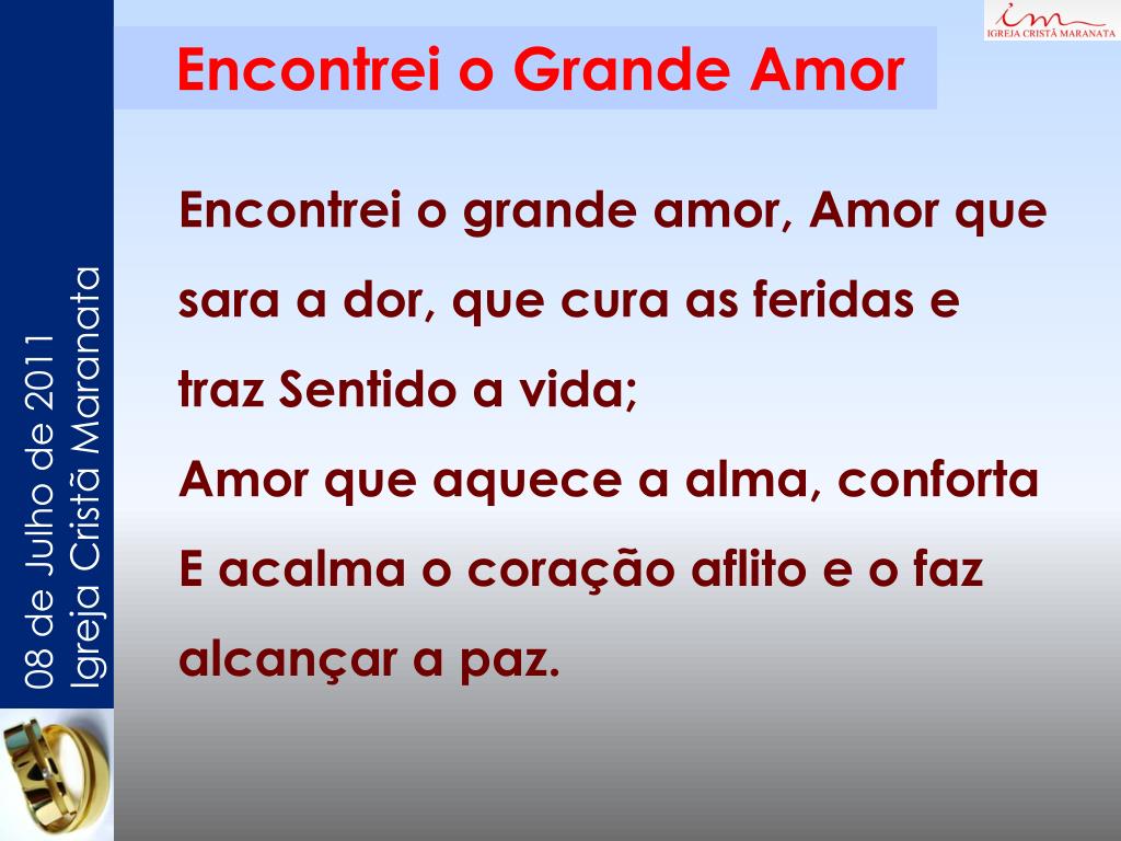 Encontrei o Grande Amor Encontrei o grande amor, Amor que sara a dor, que cura as feridas e traz Sentido a vida; Amor que aquece a alma, conforta E acalma o coração aflito e o faz alcançar a paz. 08 de Julho de 2011 Igreja Cristã Maranata