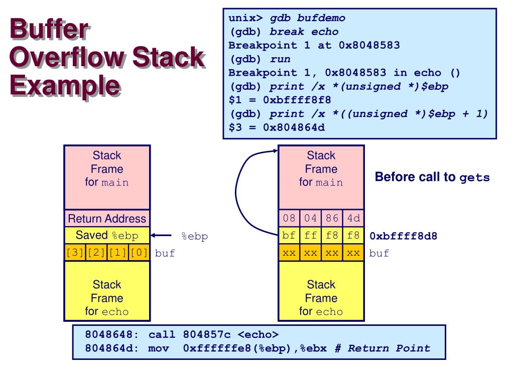 Vulnerable Buffer Code /* Echo Line */void echo(){ char buf[4]; /* Way too small! */ gets(buf); puts(buf);} int main(){ printf("Type a string:"); echo(); return 0;}