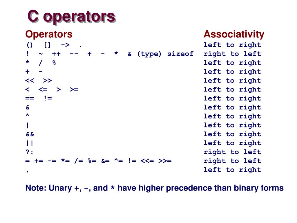 C operators Operators Associativity () [] -> . left to right ! ~ ++ -- + - * & (type) sizeof right to left * / % left to right + - left to right << >> left to right < <= > >= left to right == != left to right & left to right ^ left to right | left to right && left to right || left to right ?: right to left = += -= *= /= %= &= ^= != <<= >>= right to left , left to right Note: Unary +, -, and * have higher precedence than binary forms