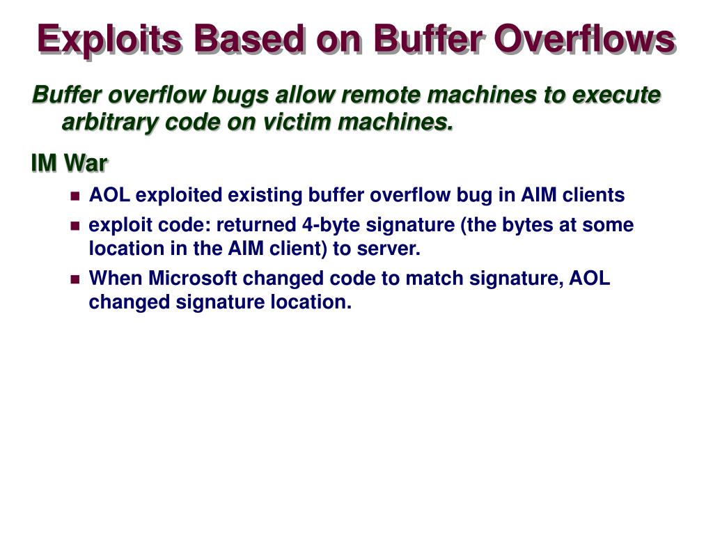 Exploits Based on Buffer Overflows • Buffer overflow bugs allow remote machines to execute arbitrary code on victim machines. • IM War • AOL exploited existing buffer overflow bug in AIM clients • exploit code: returned 4-byte signature (the bytes at some location in the AIM client) to server. • When Microsoft changed code to match signature, AOL changed signature location.