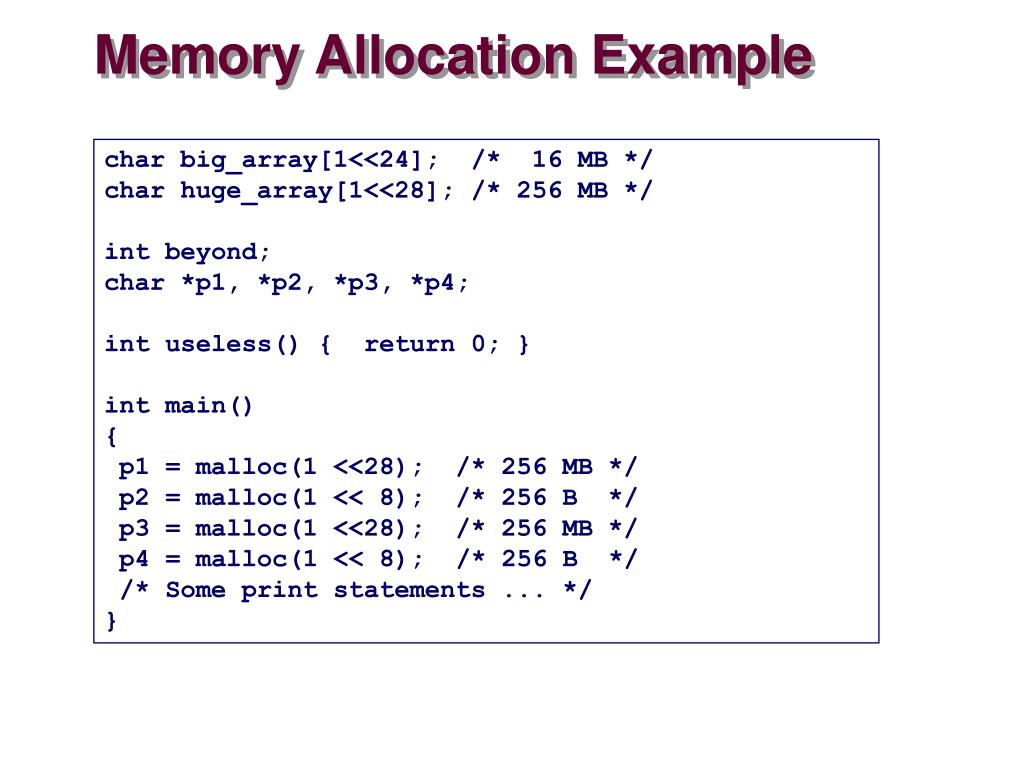 Memory Allocation Example char big_array[1<<24]; /* 16 MB */ char huge_array[1<<28]; /* 256 MB */ int beyond; char *p1, *p2, *p3, *p4; int useless() { return 0; } int main() { p1 = malloc(1 <<28); /* 256 MB */ p2 = malloc(1 << 8); /* 256 B */ p3 = malloc(1 <<28); /* 256 MB */ p4 = malloc(1 << 8); /* 256 B */ /* Some print statements ... */ }