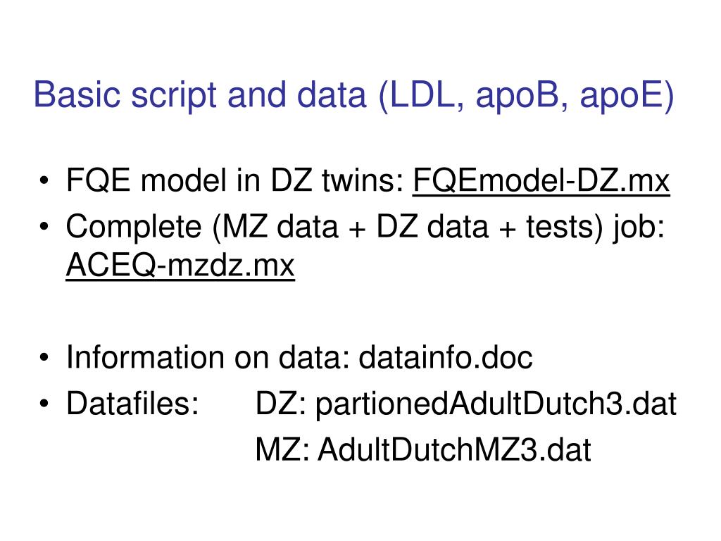 Basic script and data (LDL, apoB, apoE) • FQE model in DZ twins: FQEmodel-DZ.mx • Complete (MZ data + DZ data + tests) job: ACEQ-mzdz.mx • Information on data: datainfo.doc • Datafiles: DZ: partionedAdultDutch3.dat MZ: AdultDutchMZ3.dat