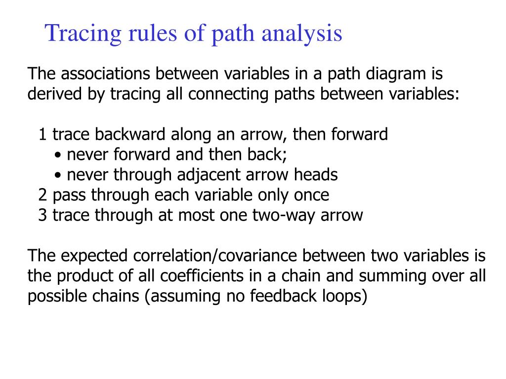Tracing rules of path analysis • The associations between variables in a path diagram is derived by tracing all connecting paths between variables: • 1 trace backward along an arrow, then forward • never forward and then back; • never through adjacent arrow heads • 2 pass through each variable only once • 3 trace through at most one two-way arrow • The expected correlation/covariance between two variables is the product of all coefficients in a chain and summing over all possible chains (assuming no feedback loops)