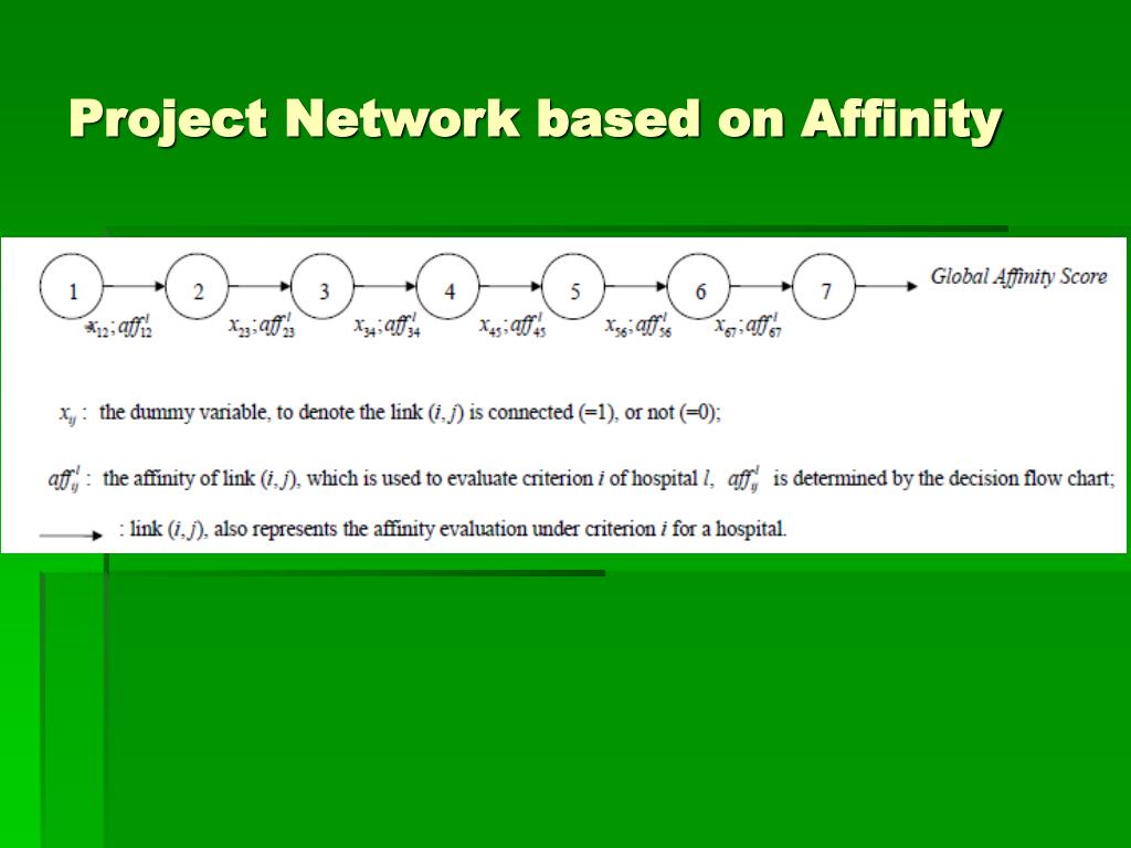 3. The Model and Example • Find the hospital that maximizing the global affinity • Constrained to the decision process/flow chart • Considered criteria: • Supply side: number of doctors on call (C1), special life support (C2), number of available beds (C3), rank of hospital (C4), distance to hospital (C5), number of specialty doctor (C6) • Demand side: TTAS, RTS
