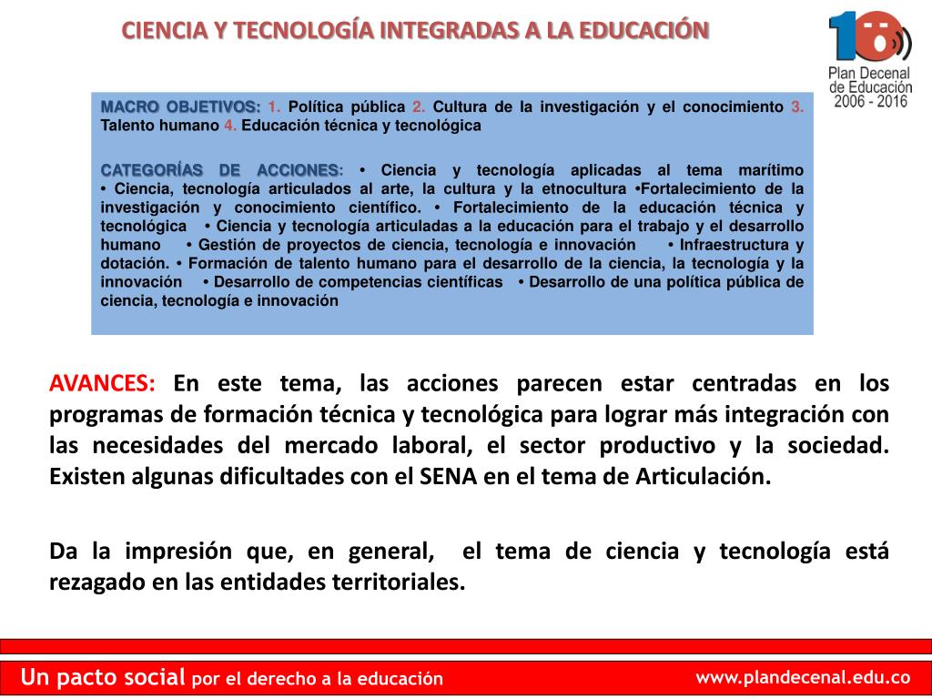 CIENCIA Y TECNOLOGÍA INTEGRADAS A LA EDUCACIÓN MACRO OBJETIVOS: 1. Política pública 2. Cultura de la investigación y el conocimiento 3. Talento humano 4. Educación técnica y tecnológica CATEGORÍAS DE ACCIONES: • Ciencia y tecnología aplicadas al tema marítimo• Ciencia, tecnología articulados al arte, la cultura y la etnocultura •Fortalecimiento de la investigación y conocimiento científico. • Fortalecimiento de la educación técnica y tecnológica • Ciencia y tecnología articuladas a la educación para el trabajo y el desarrollo humano • Gestión de proyectos de ciencia, tecnología e innovación • Infraestructura y dotación. • Formación de talento humano para el desarrollo de la ciencia, la tecnología y la innovación • Desarrollo de competencias científicas • Desarrollo de una política pública de ciencia, tecnología e innovación AVANCES: En este tema, las acciones parecen estar centradas en los programas de formación técnica y tecnológica para lograr más integración con las necesidades del mercado laboral, el sector productivo y la sociedad. Existen algunas dificultades con el SENA en el tema de Articulación. Da la impresión que, en general, el tema de ciencia y tecnología está rezagado en las entidades territoriales.