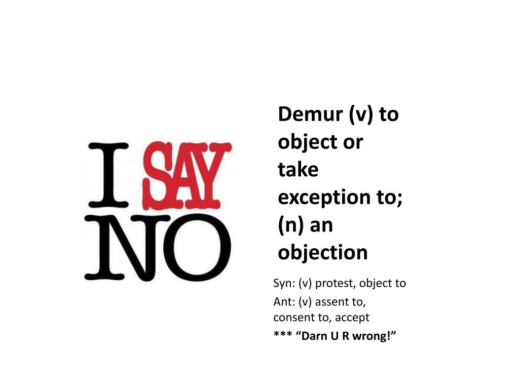 Demur (v) to object or take exception to; (n) an objection Syn: (v) protest, object to Ant: (v) assent to, consent to, accept *** “Darn U R wrong!”