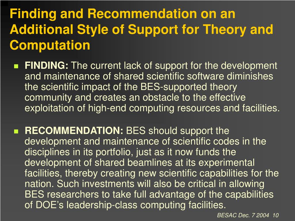 Finding and Recommendation on an Additional Style of Support for Theory and Computation • FINDING: The current lack of support for the development and maintenance of shared scientific software diminishes the scientific impact of the BES-supported theory community and creates an obstacle to the effective exploitation of high-end computing resources and facilities. • RECOMMENDATION: BES should support the development and maintenance of scientific codes in the disciplines in its portfolio, just as it now funds the development of shared beamlines at its experimental facilities, thereby creating new scientific capabilities for the nation. Such investments will also be critical in allowing BES researchers to take full advantage of the capabilities of DOE’s leadership-class computing facilities.