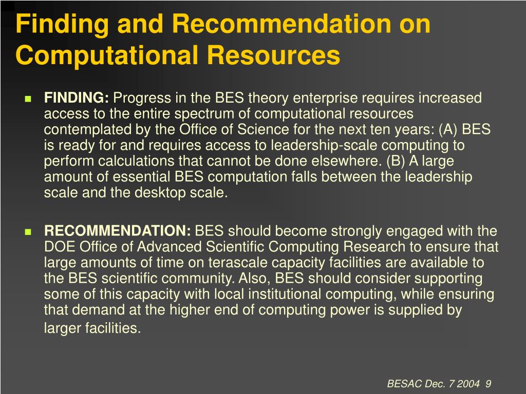 Finding and Recommendation on Computational Resources • FINDING: Progress in the BES theory enterprise requires increased access to the entire spectrum of computational resources contemplated by the Office of Science for the next ten years: (A) BES is ready for and requires access to leadership-scale computing to perform calculations that cannot be done elsewhere. (B) A large amount of essential BES computation falls between the leadership scale and the desktop scale. • RECOMMENDATION: BES should become strongly engaged with the DOE Office of Advanced Scientific Computing Research to ensure that large amounts of time on terascale capacity facilities are available to the BES scientific community. Also, BES should consider supporting some of this capacity with local institutional computing, while ensuring that demand at the higher end of computing power is supplied by larger facilities.
