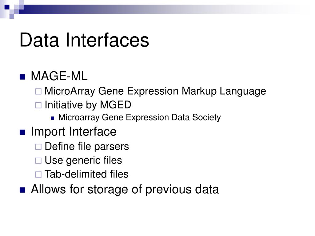Data Interfaces • MAGE-ML • MicroArray Gene Expression Markup Language • Initiative by MGED • Microarray Gene Expression Data Society • Import Interface • Define file parsers • Use generic files • Tab-delimited files • Allows for storage of previous data