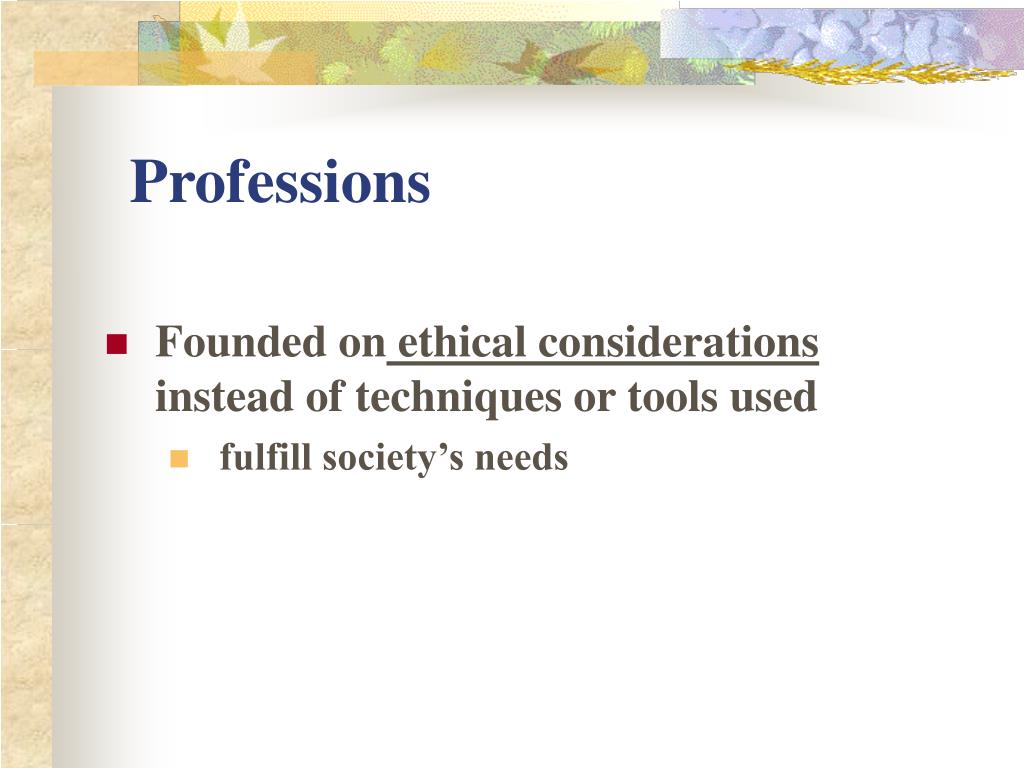 Professions • Founded on ethical considerations instead of techniques or tools used • fulfill society’s needs