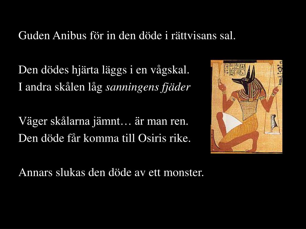 Guden Anibus för in den döde i rättvisans sal. Den dödes hjärta läggs i en vågskal. I andra skålen låg sanningens fjäder Väger skålarna jämnt… är man ren. Den döde får komma till Osiris rike. Annars slukas den döde av ett monster.