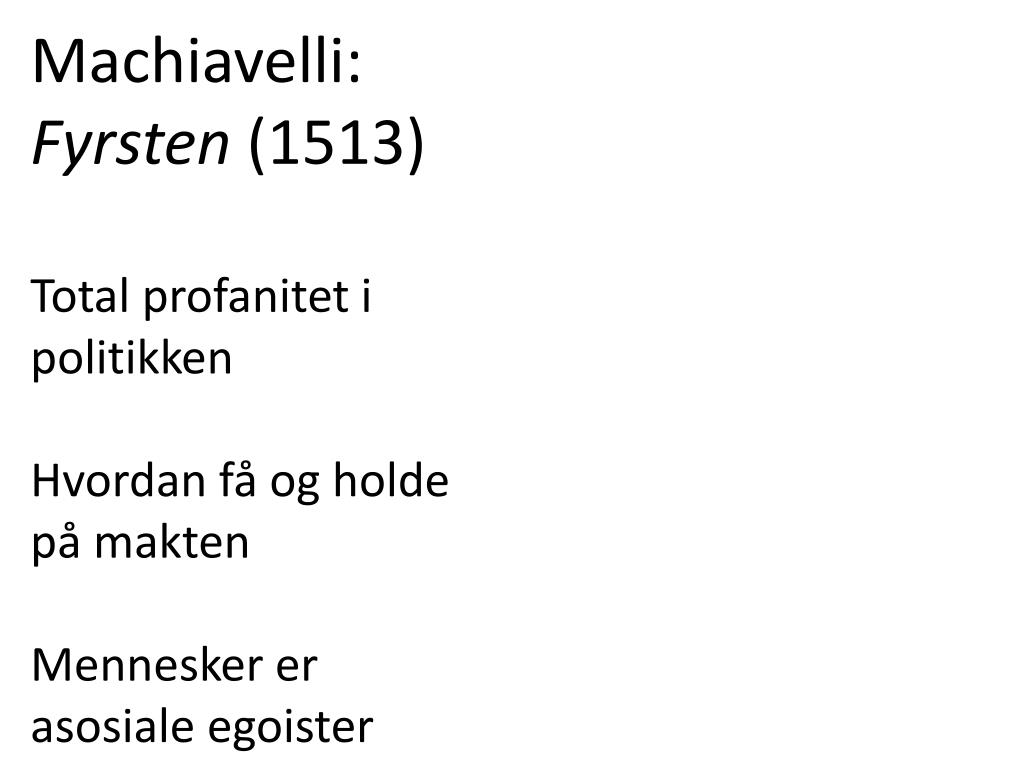 Machiavelli: Fyrsten (1513) Total profanitet i politikken Hvordan få og holde på makten Mennesker er asosiale egoister
