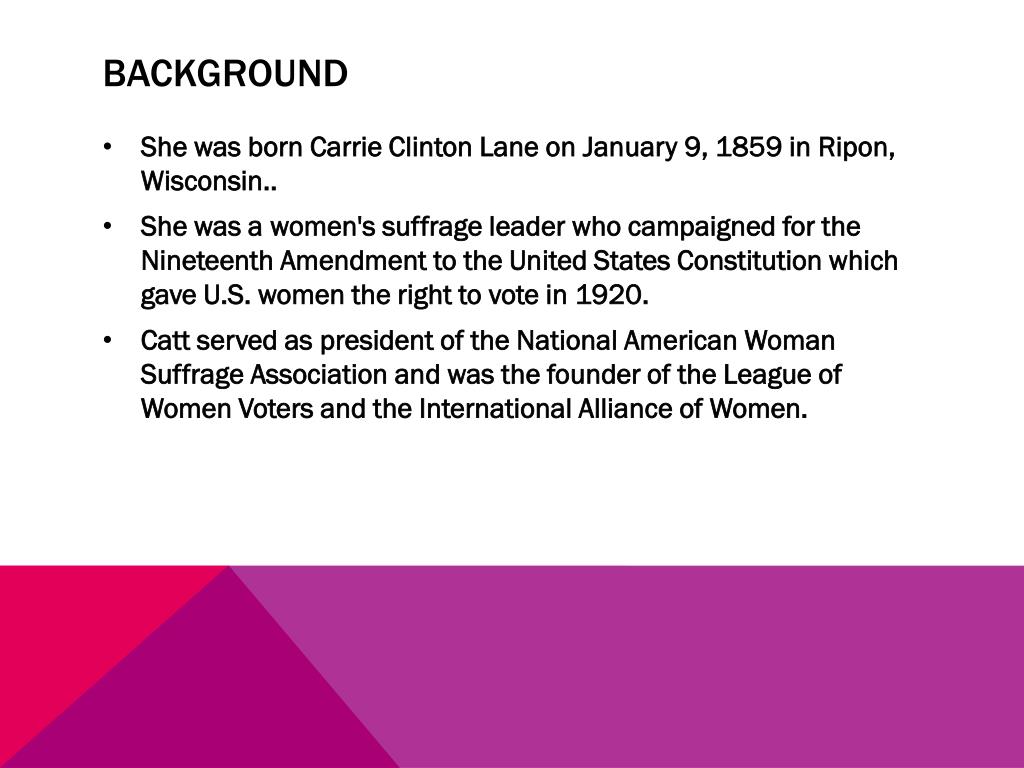 Background • She was born Carrie Clinton Lane on January 9, 1859 in Ripon, Wisconsin.. • She was a women's suffrage leader who campaigned for the Nineteenth Amendment to the United States Constitution which gave U.S. women the right to vote in 1920. • Catt served as president of the National American Woman Suffrage Association and was the founder of the League of Women Voters and the International Alliance of Women.