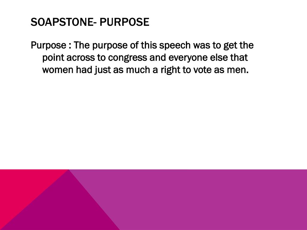 SOAPSTone- Purpose • Purpose : The purpose of this speech was to get the point across to congress and everyone else that women had just as much a right to vote as men.