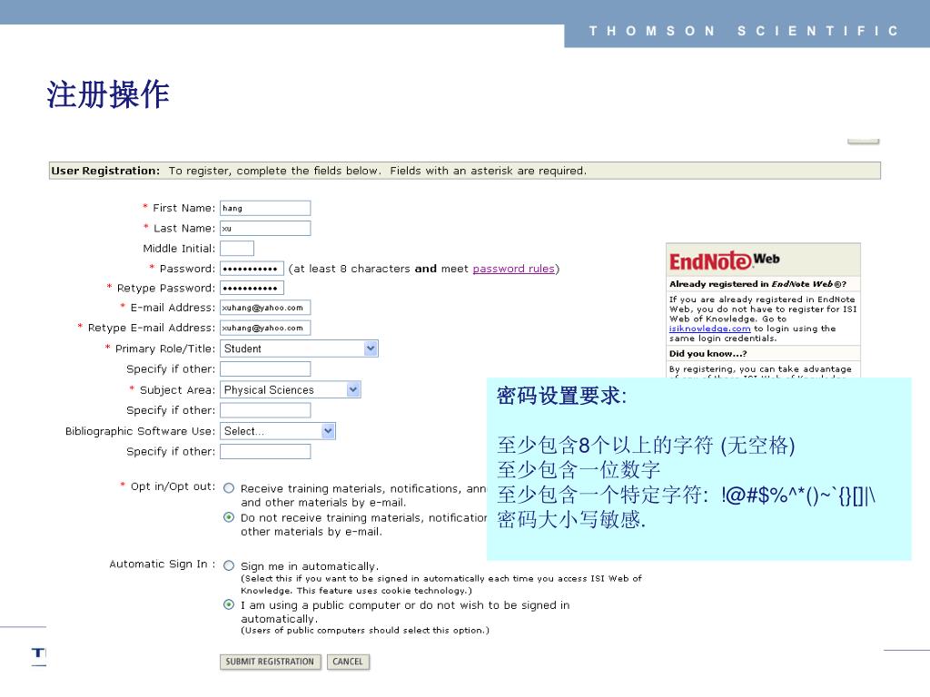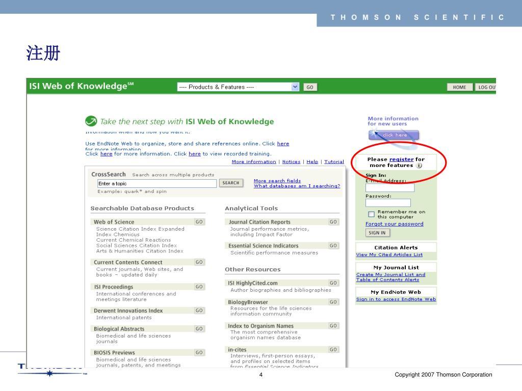 谢谢! 100080 北京市海淀区科学院南路2号 融科资讯中心A座407室 汤姆森科技信息集团中国办事处 张帆 Email: ts.support.china@thomson.com Tel: 010-82862099 Fax: 01082862088