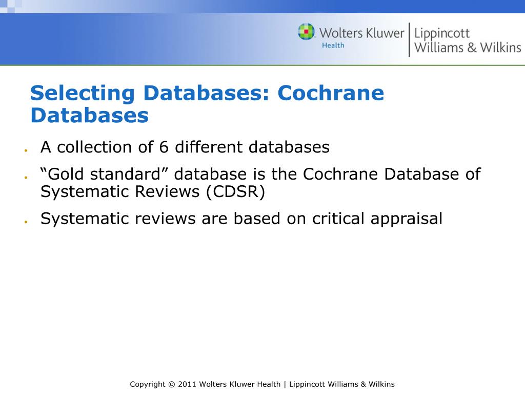 Selecting Databases: Cochrane Databases • A collection of 6 different databases • “Gold standard” database is the CochraneDatabase of Systematic Reviews (CDSR) • Systematic reviews are based on critical appraisal