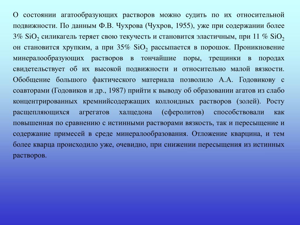 О состоянии агатообразующих растворов можно судить по их относительной подвижности. По данным Ф.В. Чухрова (Чухров, 1955), уже при содержании более 3% SiO2 силикагель теряет свою текучесть и становится эластичным, при 11 % SiO2 он становится хрупким, а при 35% SiO2 рассыпается в порошок. Проникновение минералообразующих растворов в тончайшие поры, трещинки в породах свидетельствует об их высокой подвижности и относительно малой вязкости. Обобщение большого фактического материала позволило А.А. Годовикову с соавторами (Годовиков и др., 1987) прийти к выводу об образовании агатов из слабо концентрированных кремнийсодержащих коллоидных растворов (золей). Росту расщепляющихся агрегатов халцедона (сферолитов) способствовали как повышенная по сравнению с истинными растворами вязкость, так и пересыщение и содержание примесей в среде минералообразования. Отложение кварцина, и тем более кварца происходило уже, очевидно, при снижении пересыщения из истинных растворов.