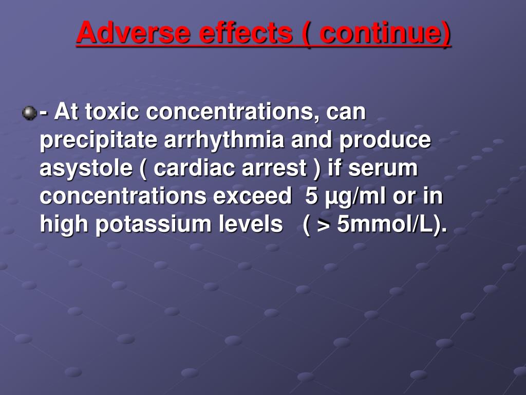 Adverse effects ( continue) • - At toxic concentrations, can precipitate arrhythmia and produce asystole ( cardiac arrest ) if serum concentrations exceed 5 µg/ml or in high potassium levels ( > 5mmol/L).