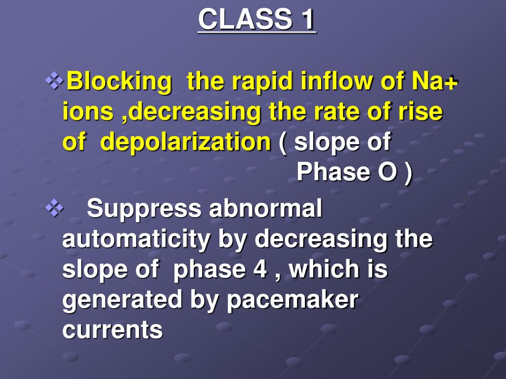 CLASS 1 • Blocking the rapid inflow of Na+ ions ,decreasing the rate of rise of depolarization (slope of Phase O ) • Suppress abnormal automaticity by decreasing the slope of phase 4 , which is generated by pacemaker currents