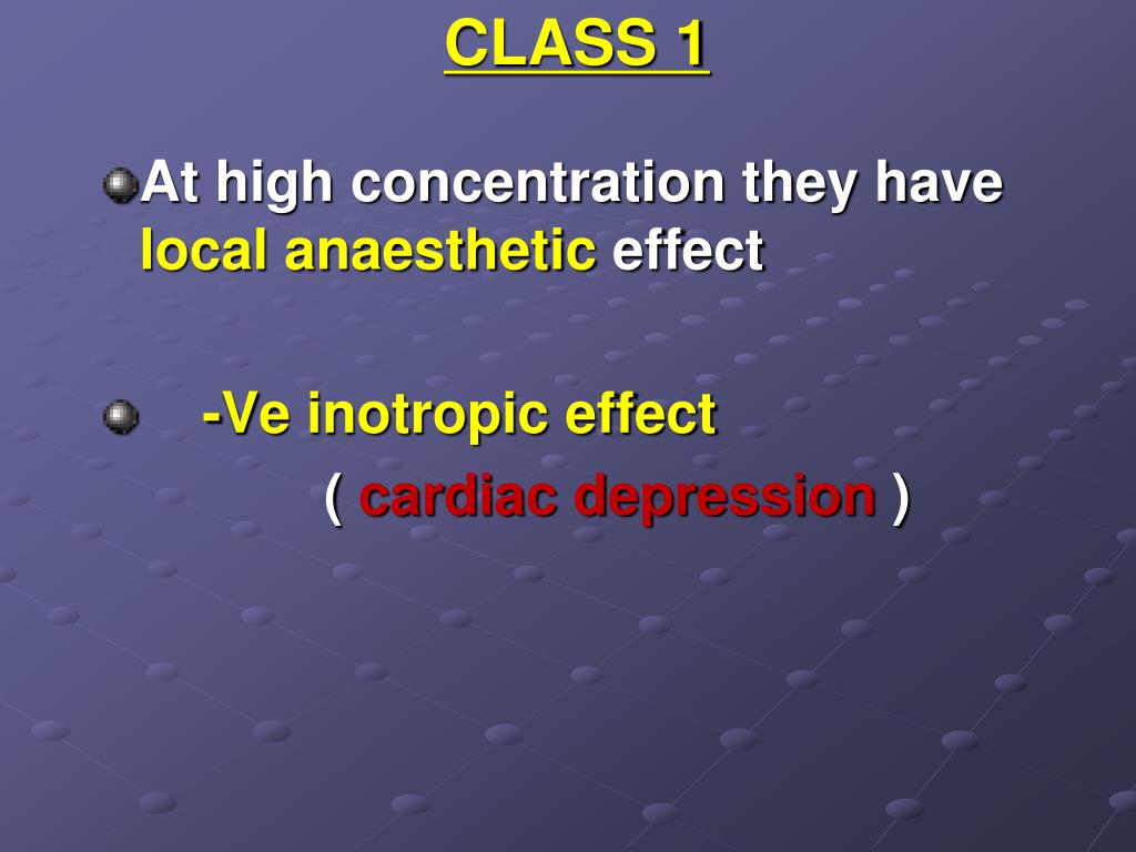 CLASS 1 • At high concentration they have local anaesthetic effect • -Ve inotropic effect ( cardiac depression )