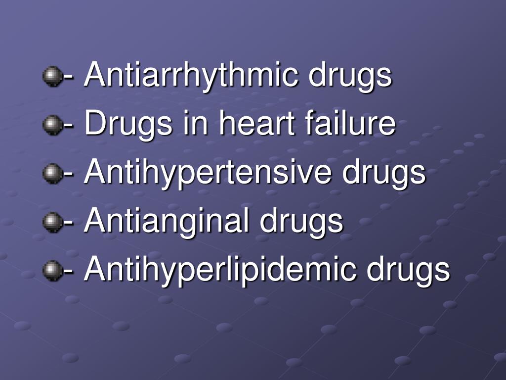 -Antiarrhythmic drugs • - Drugs in heart failure • - Antihypertensive drugs • - Antianginal drugs • - Antihyperlipidemic drugs