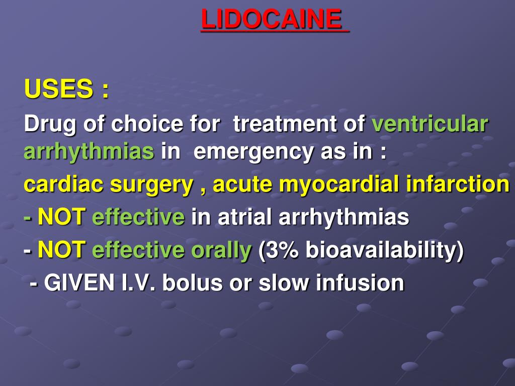LIDOCAINE USES : Drug of choice for treatment of ventriculararrhythmias in emergency as in : cardiac surgery , acute myocardial infarction - NOT effective in atrial arrhythmias - NOT effective orally (3% bioavailability) - GIVEN I.V. bolus or slow infusion