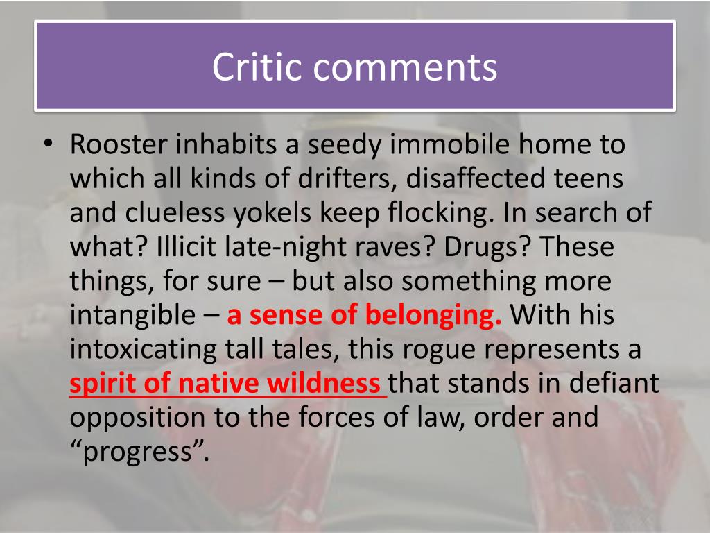 Critic comments • Rooster inhabits a seedy immobile home to which all kinds of drifters, disaffected teens and clueless yokels keep flocking. In search of what? Illicit late-night raves? Drugs? These things, for sure – but also something more intangible – a sense of belonging. With his intoxicating tall tales, this rogue represents a spirit of native wildness that stands in defiant opposition to the forces of law, order and “progress”.