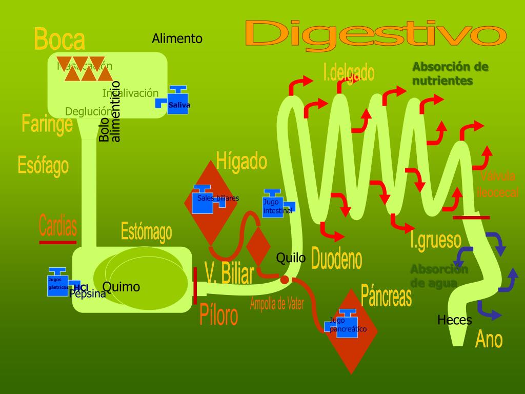 Digestivo Boca Alimento Masticación Absorción de nutrientes I.delgado Bolo alimenticio Insalivación Saliva Deglución Faringe Hígado Esófago Válvula ileocecal Sales biliares Jugo intestinal Cardias Estómago I.grueso Quilo Duodeno Absorción de agua V. Biliar Jugos gástricos Quimo HCl Pepsina Páncreas Ampolla de Vater Píloro Heces Jugo pancreático Ano