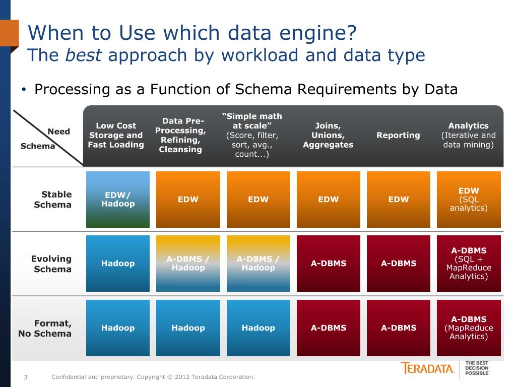 When to Use which data engine? The best approach by workload and data type • Processing as a Function of Schema Requirements by Data • Need • Schema EDW/Hadoop EDW EDW EDW EDW EDW (SQL analytics) Hadoop A-DBMS / Hadoop A-DBMS /Hadoop A-DBMS A-DBMS A-DBMS (SQL + MapReduce Analytics) Hadoop Hadoop Hadoop A-DBMS A-DBMS A-DBMS (MapReduce Analytics)