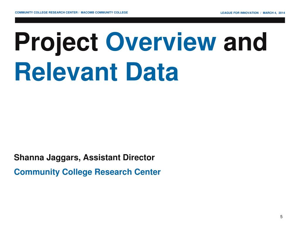 Project Overview and Relevant Data Shanna Jaggars, Assistant Director Community College Research Center
