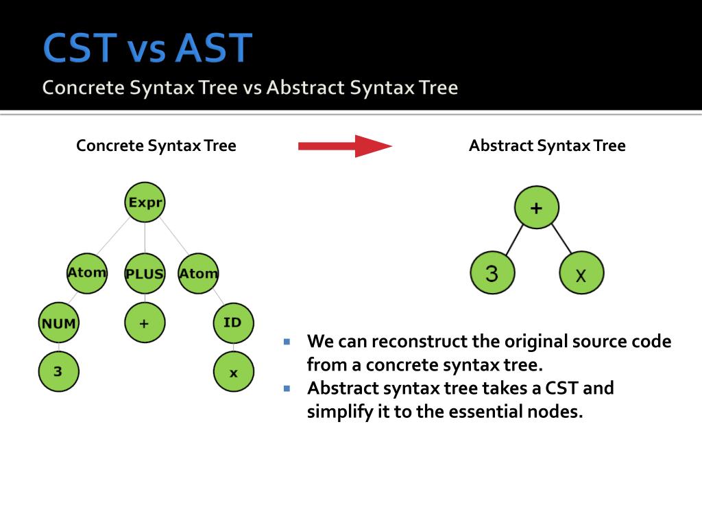 CST vs ASTConcrete Syntax Tree vs Abstract Syntax Tree Concrete Syntax Tree Abstract Syntax Tree • We can reconstruct the original source code from a concrete syntax tree. • Abstract syntax tree takes a CST and simplify it to the essential nodes.