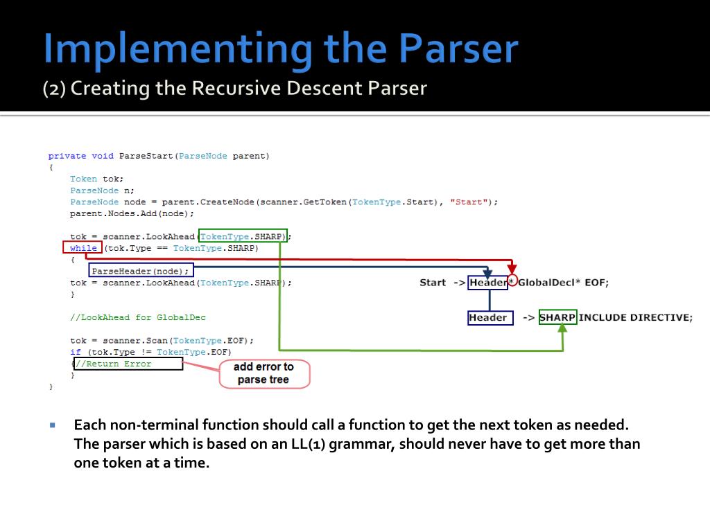 Implementing the Parser(2) Creating the Recursive Descent Parser • Each non-terminal function should call a function to get the next token as needed. The parser which is based on an LL(1) grammar, should never have to get more than one token at a time.