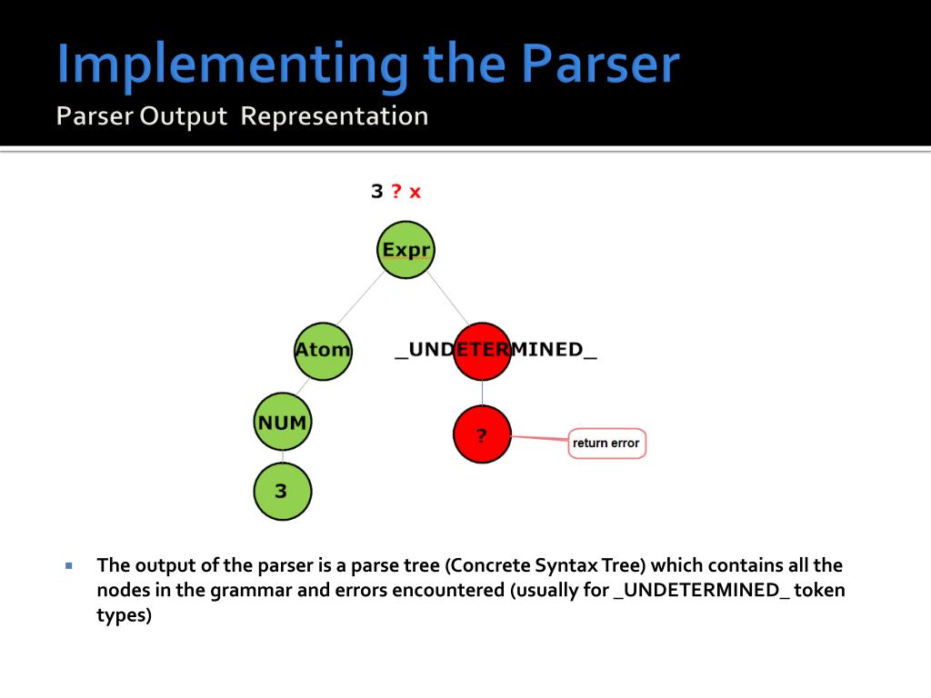 Implementing the ParserParser Output Representation • The output of the parser is a parse tree (Concrete Syntax Tree) which contains all the nodes in the grammar and errors encountered (usually for _UNDETERMINED_ token types)