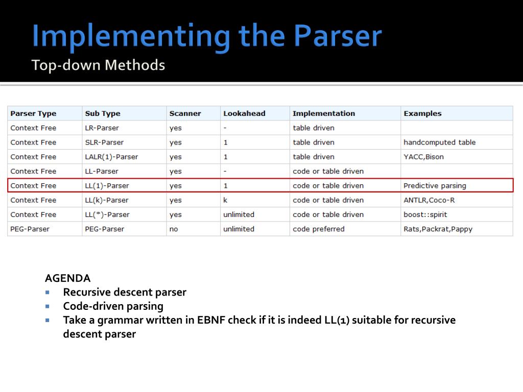 Implementing the ParserTop-down Methods • AGENDA • Recursive descent parser • Code-driven parsing • Take a grammar written in EBNF check if it is indeed LL(1) suitable for recursive descent parser