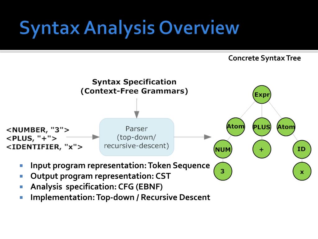 Syntax Analysis Overview Concrete Syntax Tree • Input program representation: Token Sequence • Output program representation: CST • Analysis specification: CFG (EBNF) • Implementation: Top-down / Recursive Descent