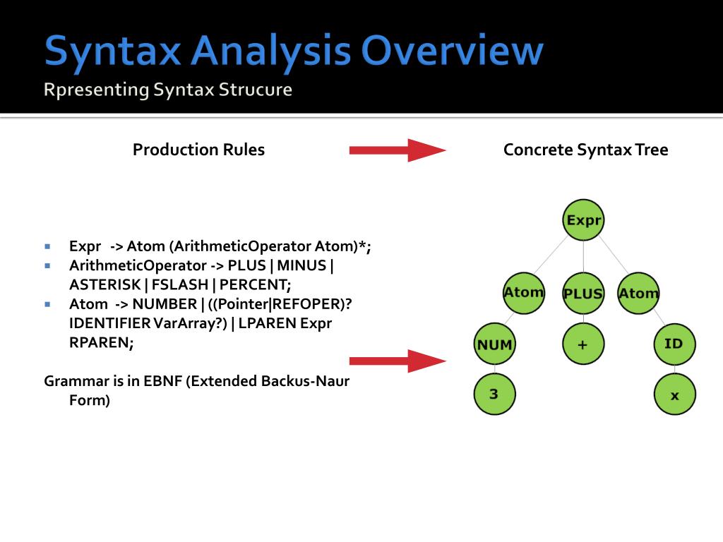Syntax Analysis OverviewRpresenting Syntax Strucure Production Rules Concrete Syntax Tree • Expr -> Atom (ArithmeticOperator Atom)*; • ArithmeticOperator -> PLUS | MINUS | ASTERISK | FSLASH | PERCENT; • Atom -> NUMBER | ((Pointer|REFOPER)? IDENTIFIER VarArray?) | LPAREN Expr RPAREN; Grammar is in EBNF (Extended Backus-Naur Form)