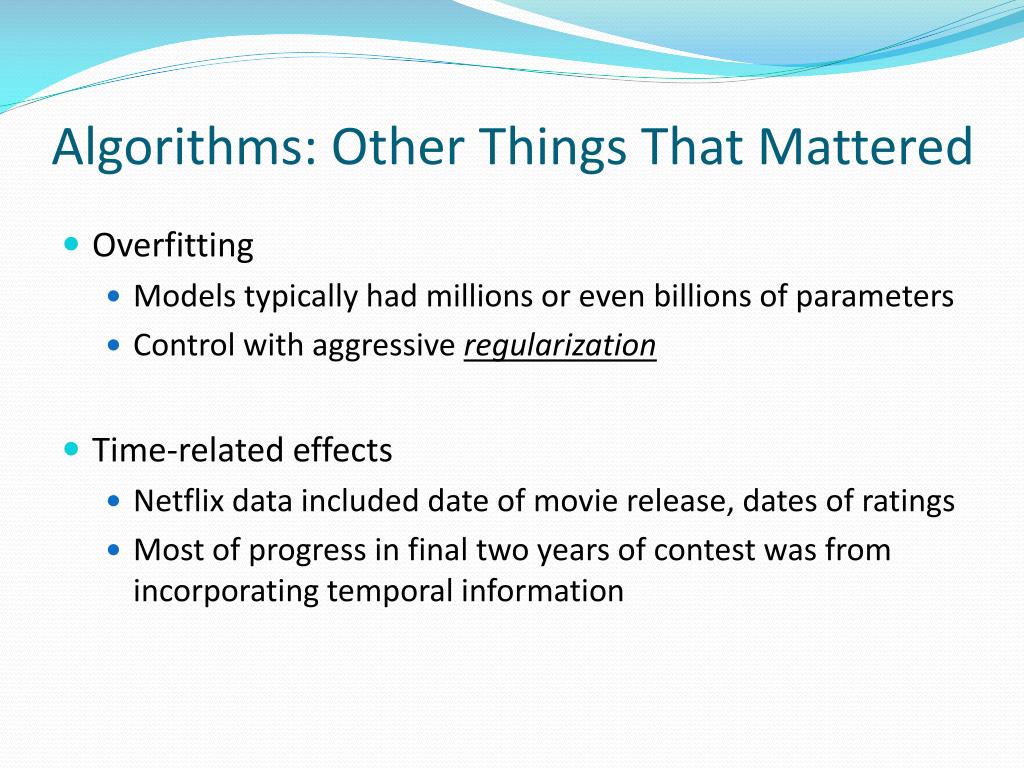 Algorithms: Other Things That Mattered • Overfitting • Models typically had millions or even billions of parameters • Control with aggressive regularization • Time-related effects • Netflix data included date of movie release, dates of ratings • Most of progress in final two years of contest was from incorporating temporal information