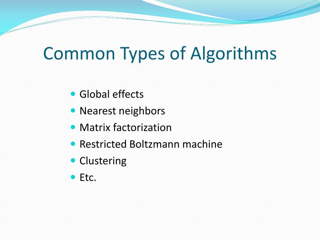 Common Types of Algorithms • Global effects • Nearest neighbors • Matrix factorization • Restricted Boltzmann machine • Clustering • Etc.