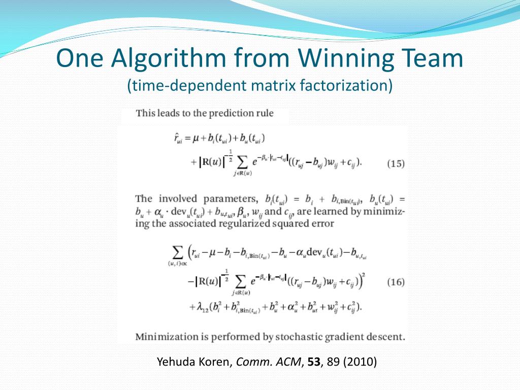 One Algorithm from Winning Team(time-dependent matrix factorization) Yehuda Koren, Comm. ACM, 53, 89 (2010)