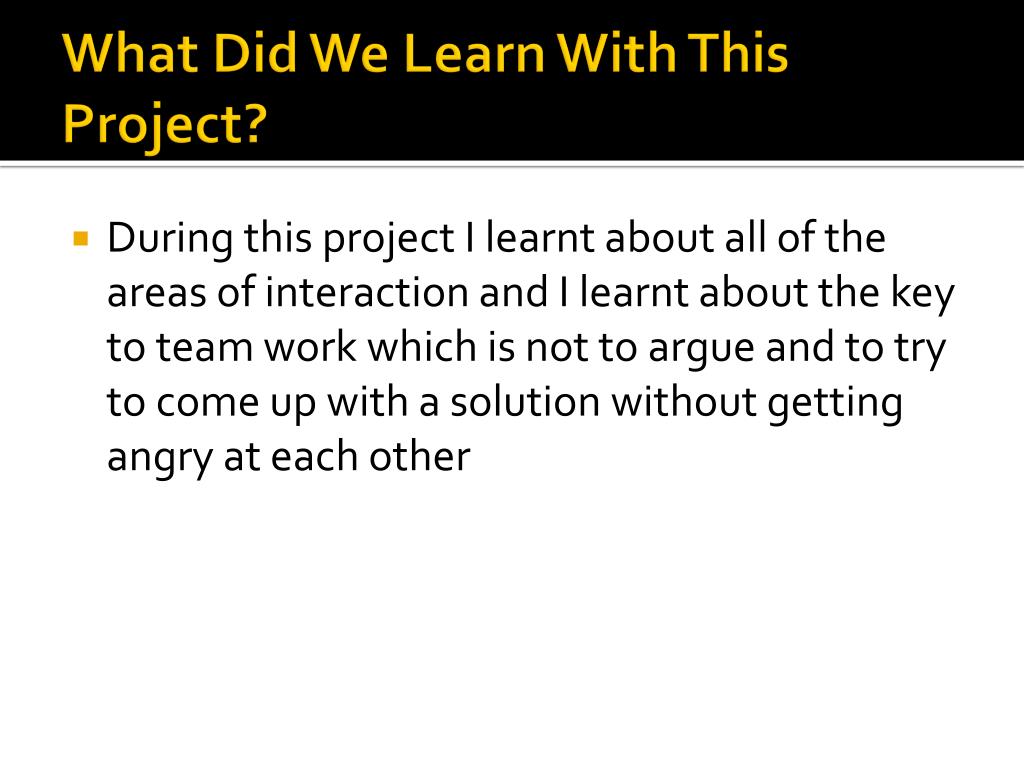 What Did We Learn With This Project? • During this project I learnt about all of the areas of interaction and I learnt about the key to team work which is not to argue and to try to come up with a solution without getting angry at each other